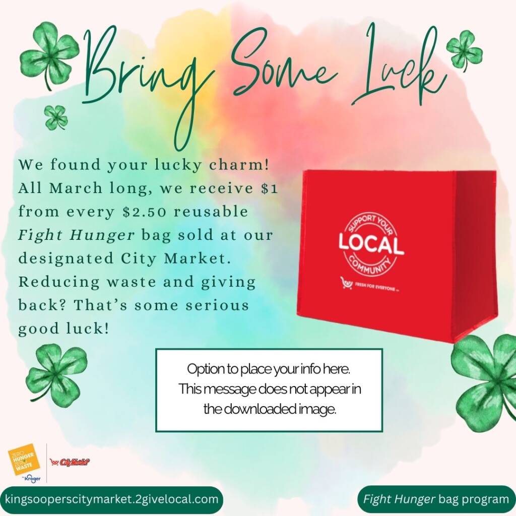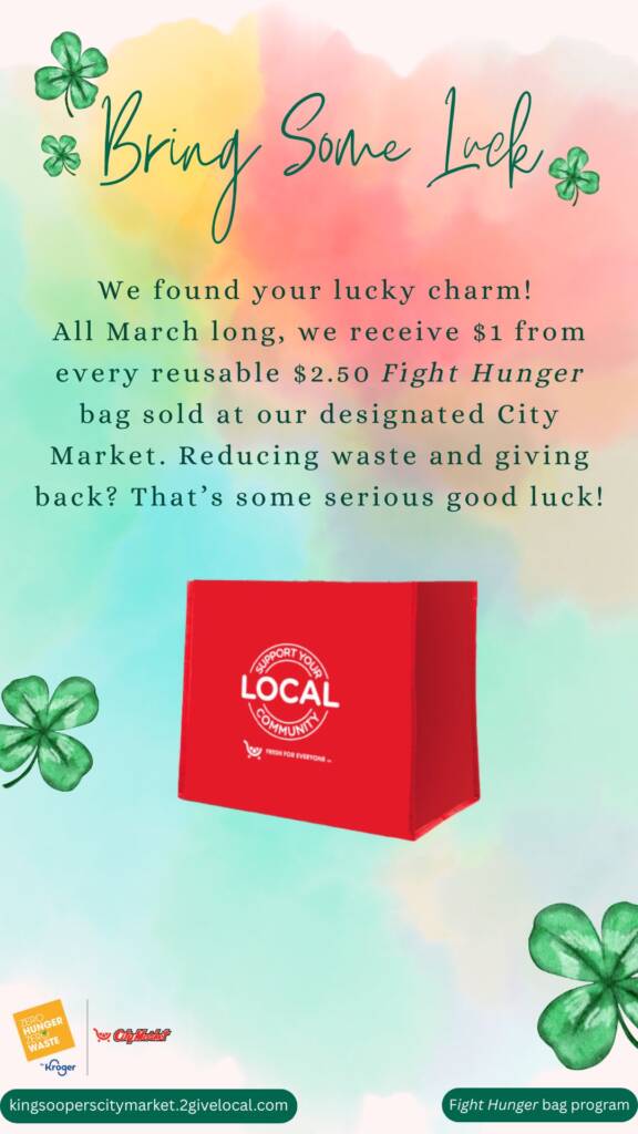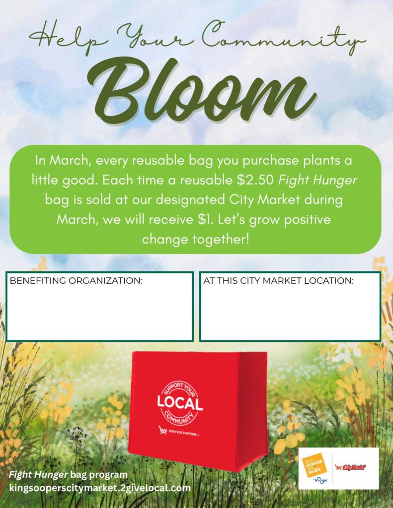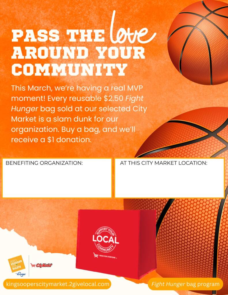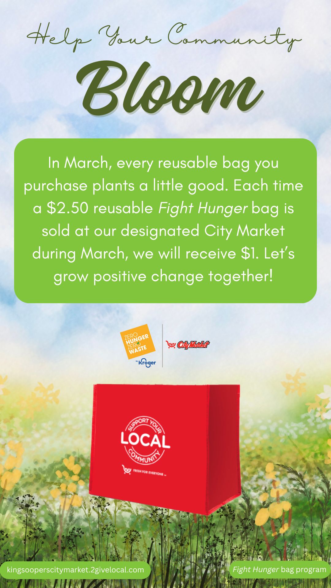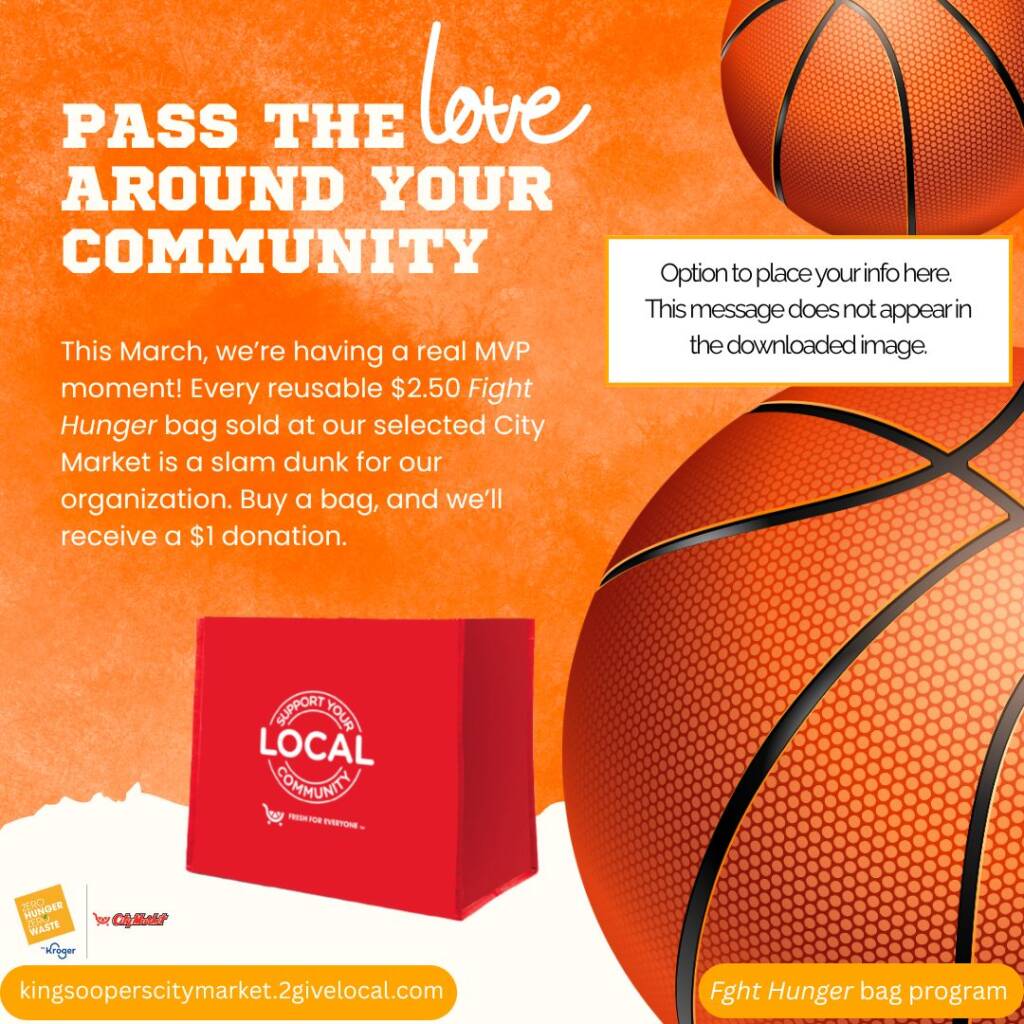Your selection period for the Fight Hunger bag program is February and March. Use the tools below to let your community know they can support you in March at your selected City Market location(s). We will provide new tools for your March benefiting month.