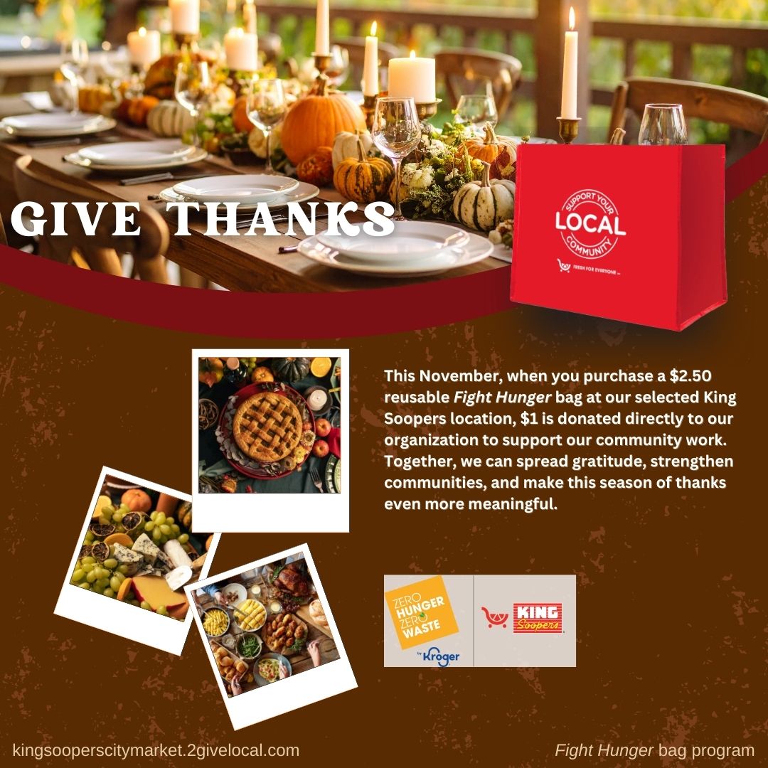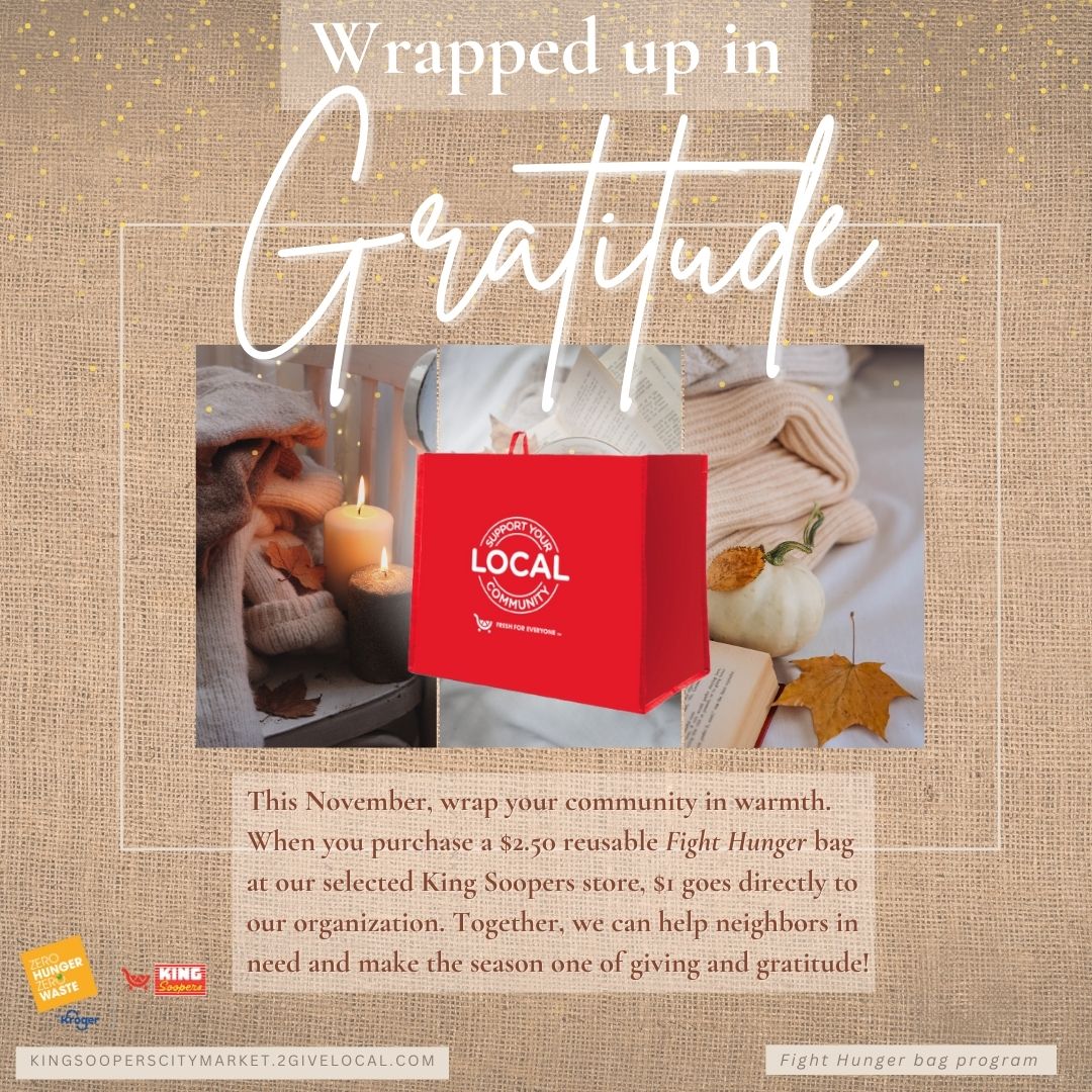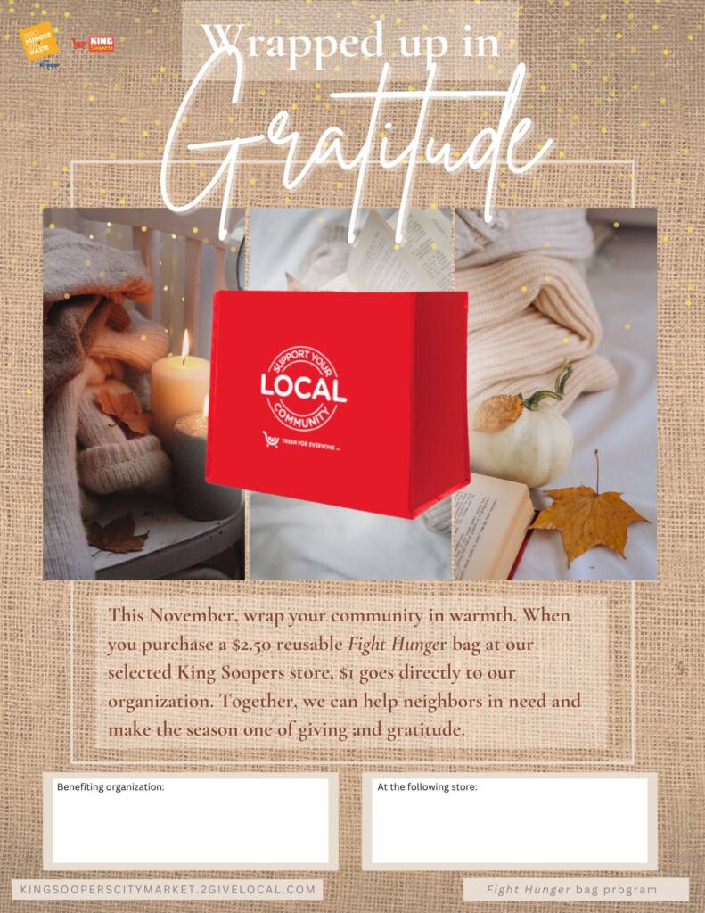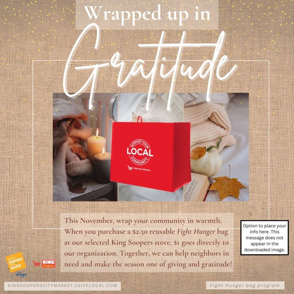 Your selection period for the Fight Hunger bag program is October and November. Use the tools below to let your community know they can support you in November at your selected King Soopers location(s)!