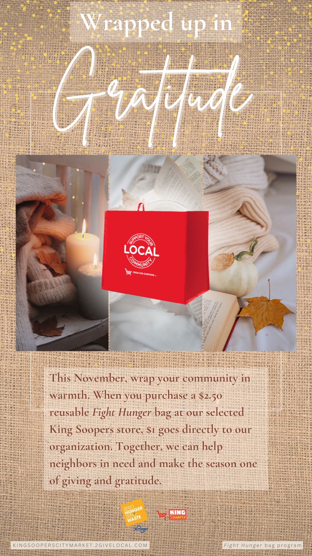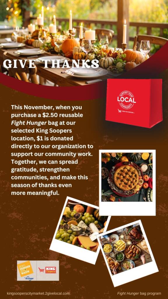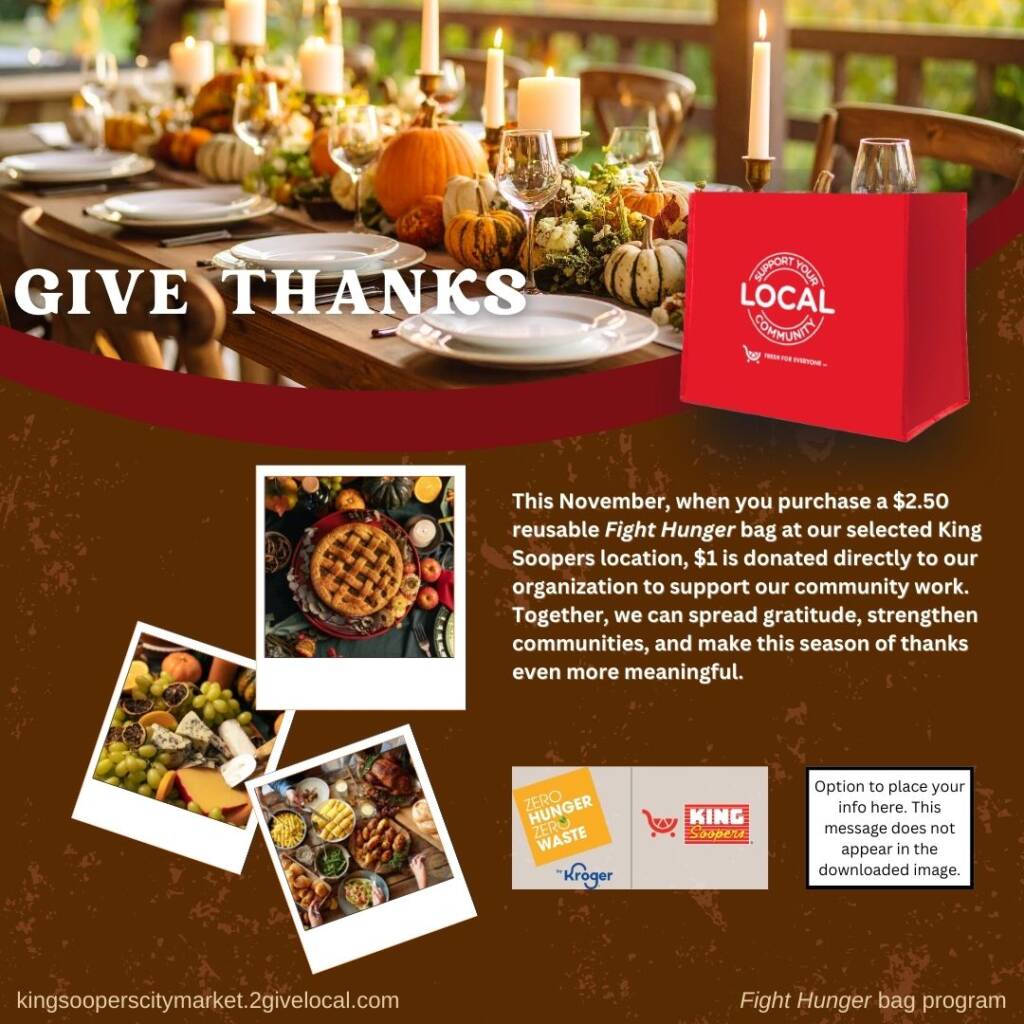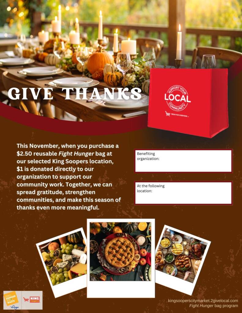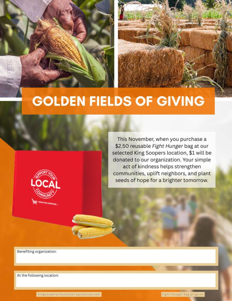 Your selection period for the Fight Hunger bag program is October and November. Use the tools below to let your community know they can support you in November at your selected King Soopers location(s)!